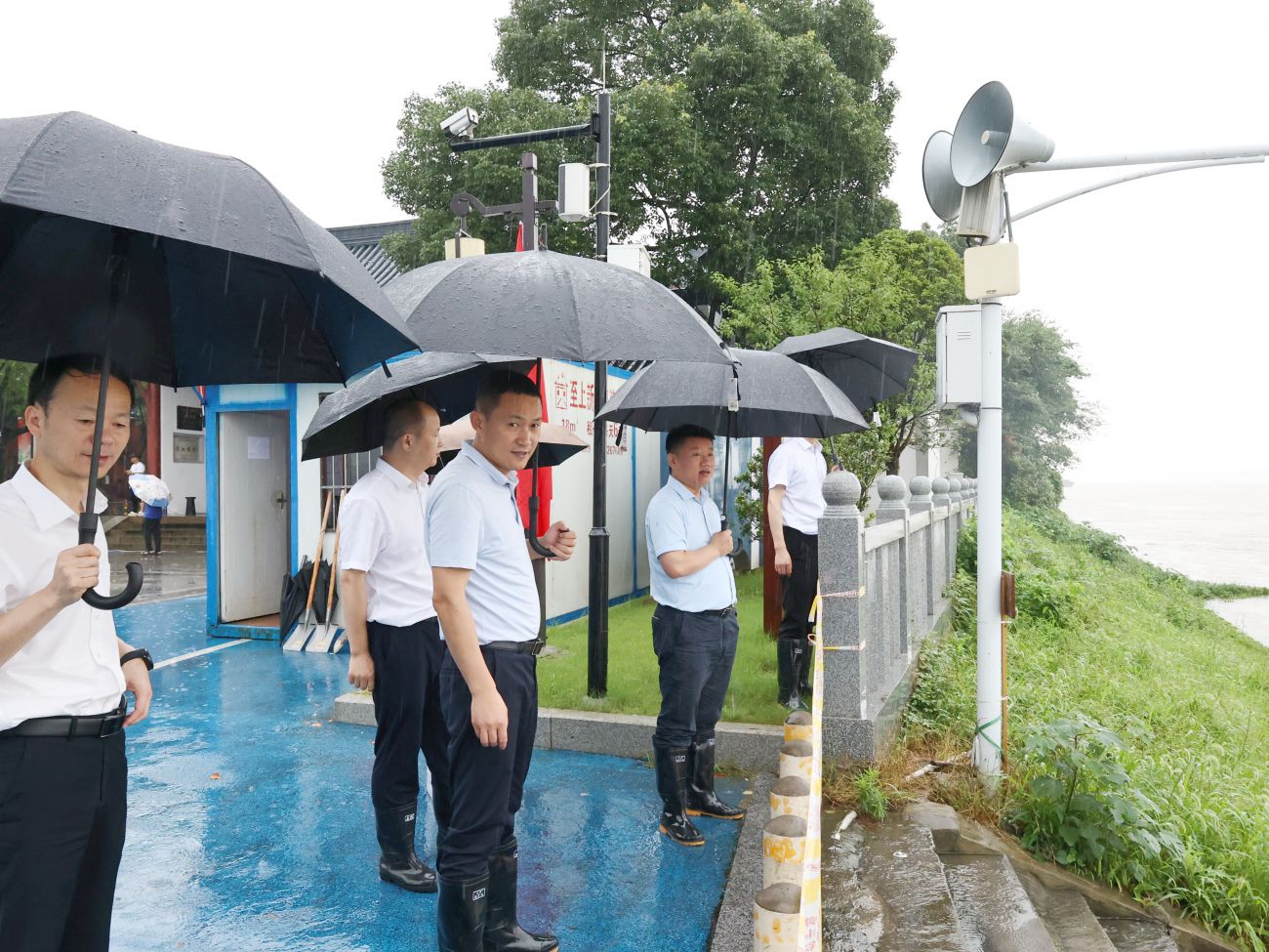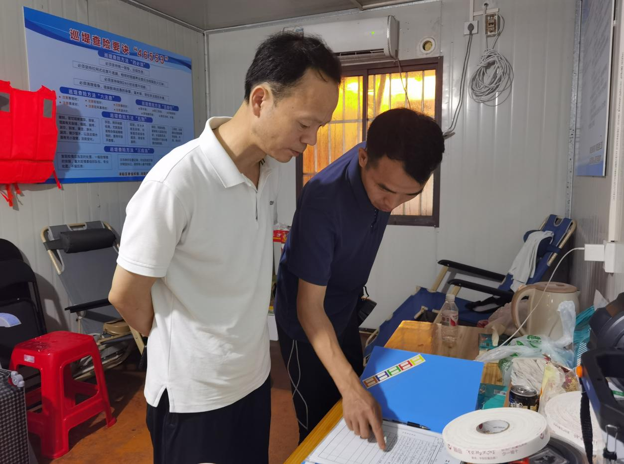 檢查組沿著堤壩察看水情水勢,詳細檢查了四個防汛點位值班值守、物資儲備、巡堤查險情況,并提出防汛工作要求:一要提高思想認識,壓緊工作責任。在多輪降水、上游分洪等不利因素下,集團上下要清醒認識到防汛形勢的復雜性、嚴峻性,堅決克服麻痹思想和僥幸心理,發(fā)揮模范帶頭作用,危難面前勇于擔當,嚴格落實防汛工作責任,做好防汛應急值守。二要強化巡堤查險,落實防汛措施。嚴格落實巡堤查險“四個六”要求,密切關(guān)注水位,加密巡查頻率,做到“不在堤上看風景、要到道閘查險情”,發(fā)現(xiàn)大量冒水冒沙情況要第一時間報告處置;做好袋裝砂石、封堵石板等防汛物資儲備工作,確保發(fā)生險情時派得出、用得上;加強天花井等景區(qū)邊坡的監(jiān)測和巡查,合理設(shè)置安全警示標志,做好滑坡、塌方等防護措施,全力以赴保障安全。三要加大監(jiān)督檢查,嚴明工作紀律。各責任領(lǐng)導要加大統(tǒng)籌力度、加強檢查調(diào)度、靠前指揮部署,全力以赴抓好各項工作落實,確保集團安全度汛;各值守人員要熟悉排險要求、掌握工作要領(lǐng),科學規(guī)范操作,嚴格交接班制度,做好巡查記錄,確保防汛工作做到實處。